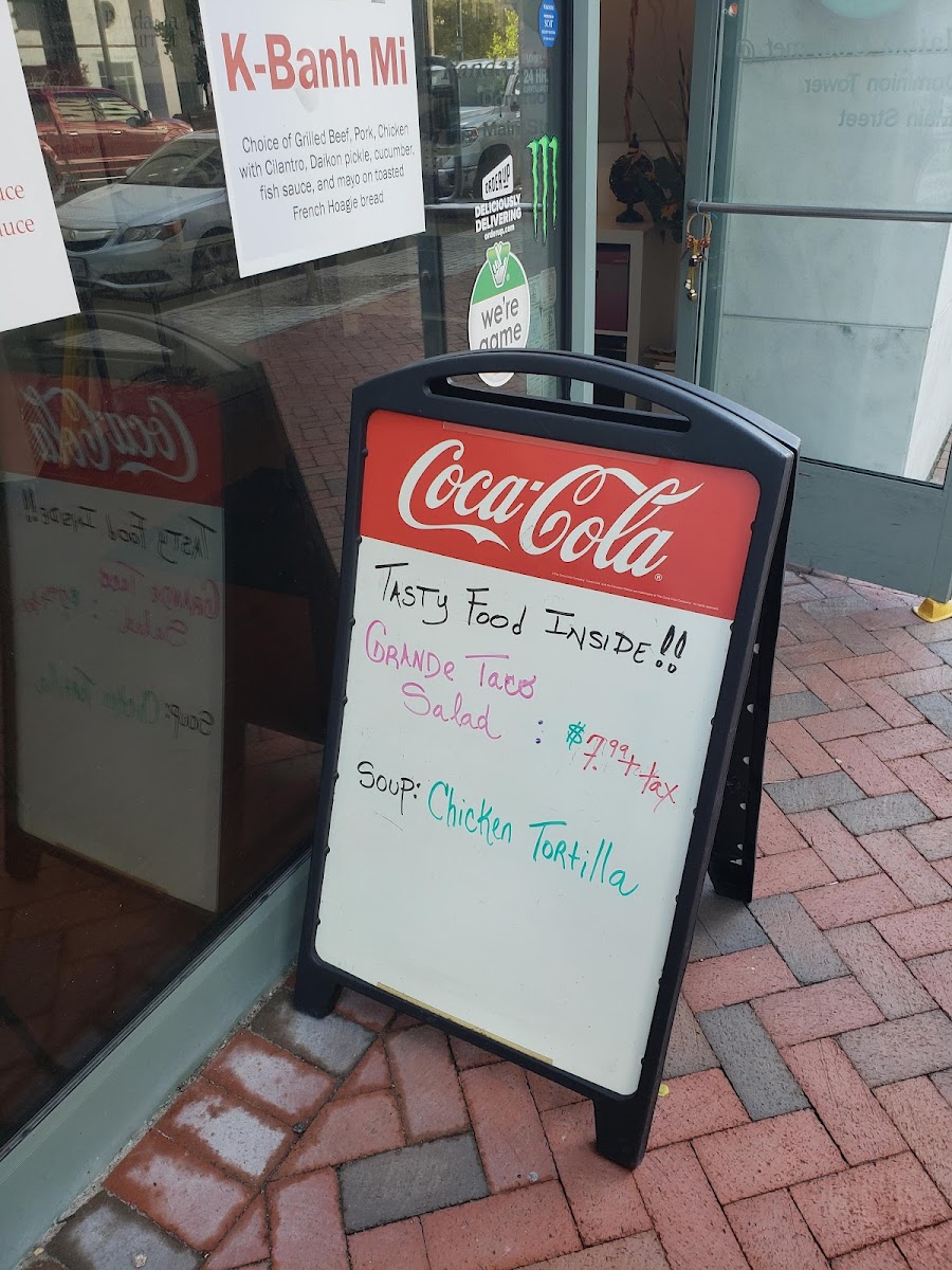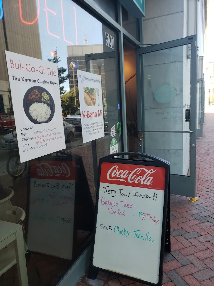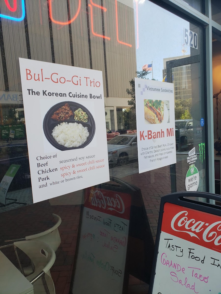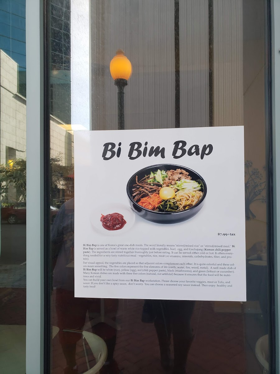 The Korean cuisine bowl comes with bul-go-gi (ground beef), soy tofu, or grilled chicken breast with your choice of 5 veggies and sauces (spicy and sweet chili paste or seasoned soy on the side). Served with choice of rice